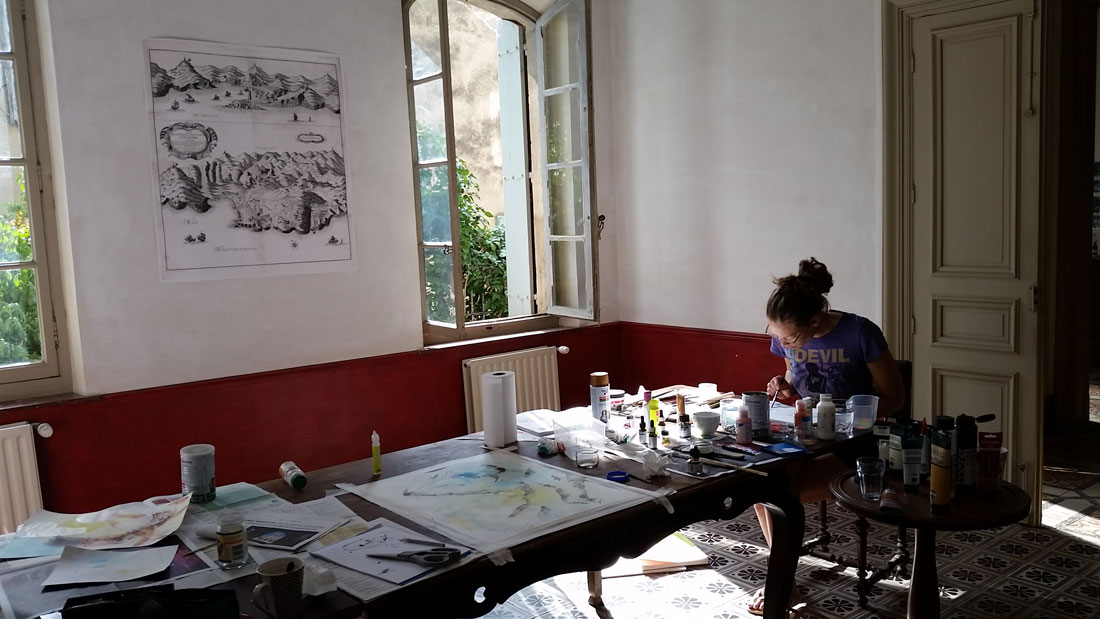 “I left the residency with a terrible desire to return, as well as the pride of belonging now a little to the beautiful story Eloise is inventing between the walls, vibrant with inspiration, of the magnificent Hotel Sainte Valiere. Rarely have I worked as well as I worked there. I have the feeling that there I could give the necessary push to lauch a new project, forever associated with the place, Eloise, and my director friend Rachel with whom we chatted beneath plane trees drinking delicious rosé!”